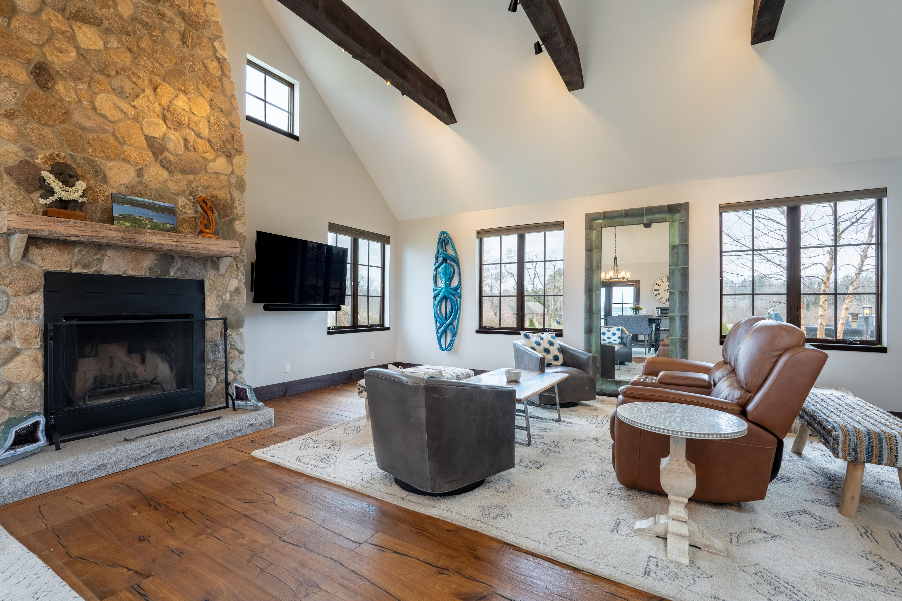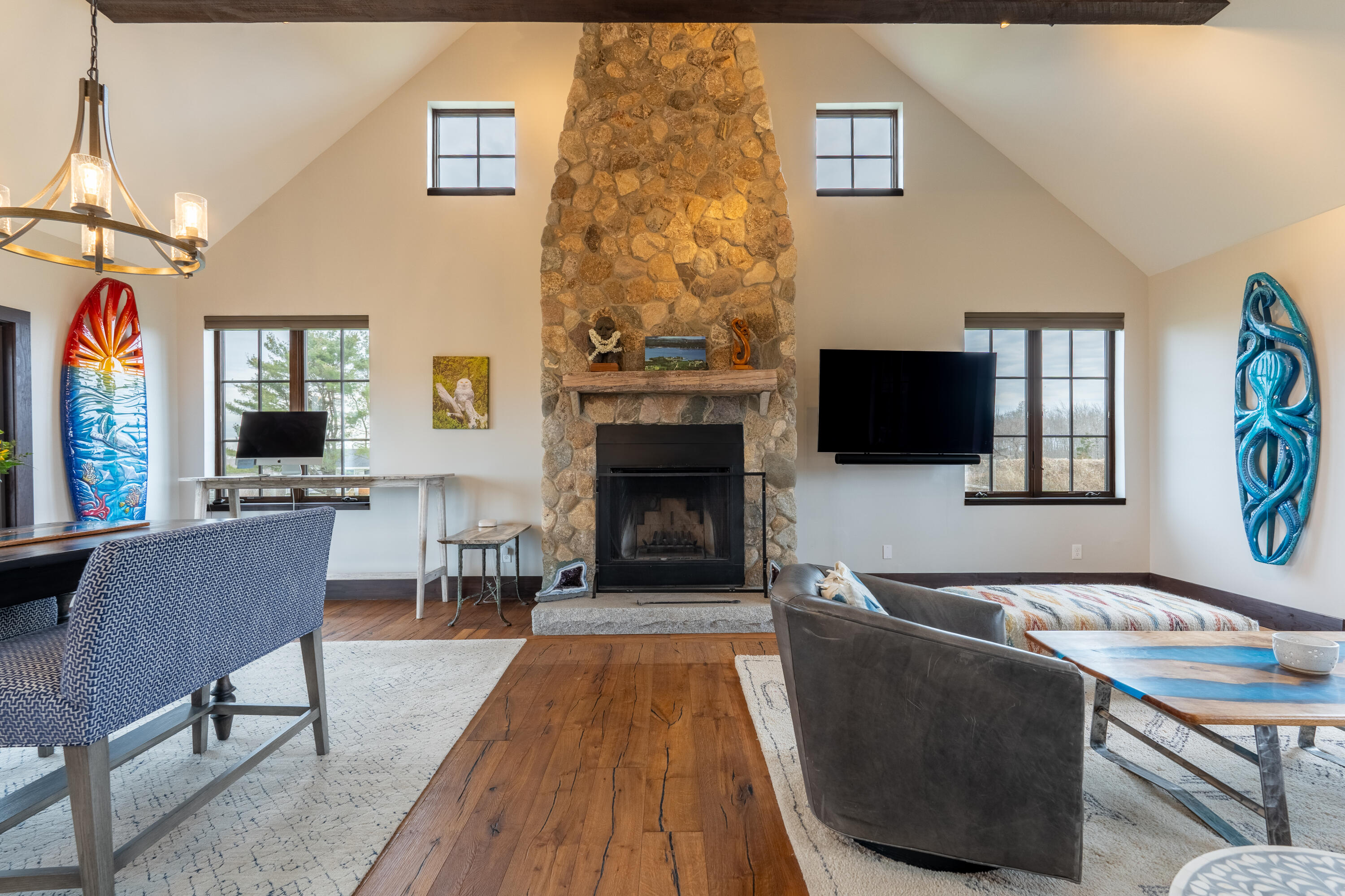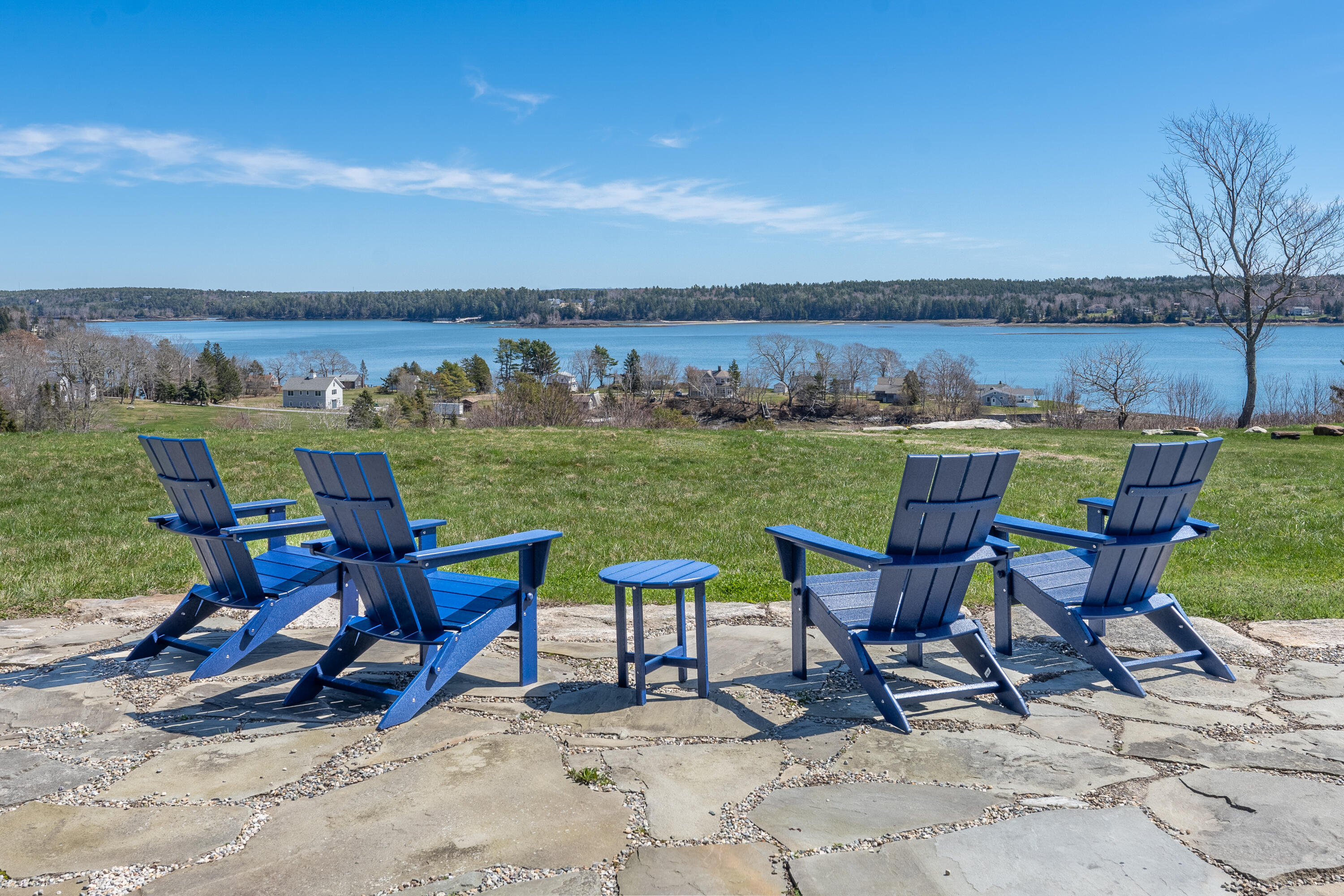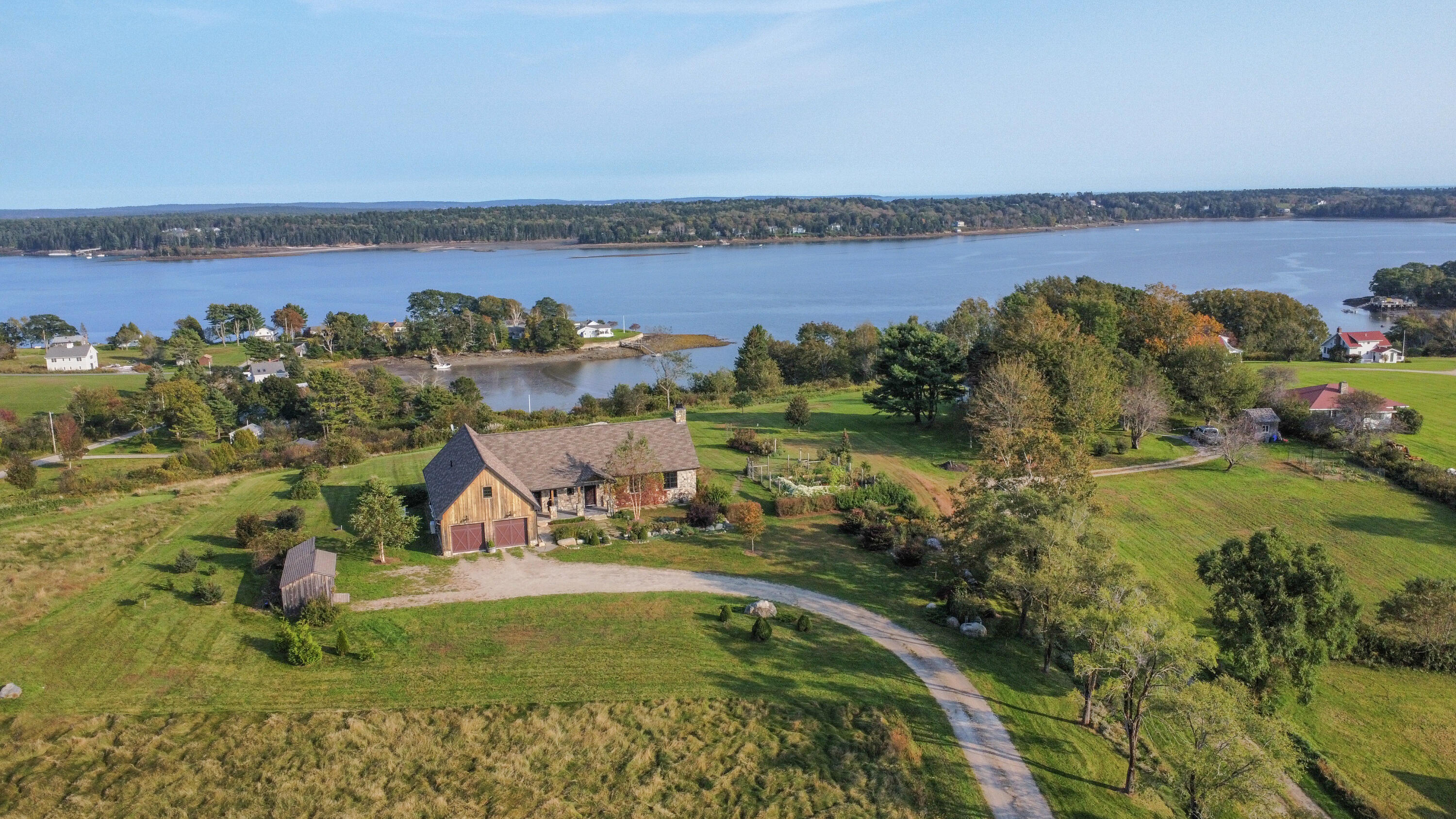 This stone-clad country estate embodies the quintessential Maine Experience. Perched on one of the highest points along the coastline, the property offers unparalleled panoramic views of the ocean, forever protected by a view easement and open green rolling fields. Come in to discover a single-level design with endless water views from every room. The great room boasts soaring beamed ceilings and a stone wood-burning fireplace. Enjoy the open-concept chef's kitchen, complete with a new Viking range which beckons you to partake in culinary adventures. French doors lead to a spacious stone patio, perfect for dining alfresco and soaking in the serene setting. Constructed with high-end finishes, this home exudes quality with timeless appeal. Just outside your coastal haven, the surrounding property is a testament to Maine's natural splendor, with open fields & curated gardens that provide a sense of tranquility without sacrificing privacy.